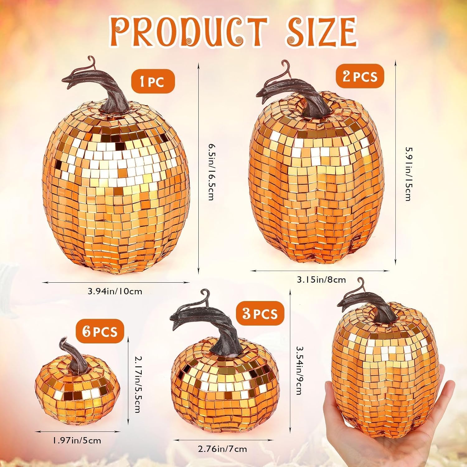 Features: Multiple uses: The thanksgiving disco pumpkin set are not only suitable for farmhouse decor, but also applicable for house decorating at Thanksgiving party. In addition, you can use the pumpkins as decorations for photography. Enrich your relationship: The Thanksgiving pumpkin set are delicate, practical for house decoration, you can give them to your friends, family members, neighbors and other people in need as housewarming gifts, showing your love and care. Specifications: Color: as pictures shownSize of wreaths:about 3.94 inches, 3.15 inches, 2.76 inches, and 1.97 inchesPackage includes: 12 x Thanksgiving disco pumpkinsNotes: Manual measurement, please allow slight errors on size. The color may exist slight difference due to different screen displays.