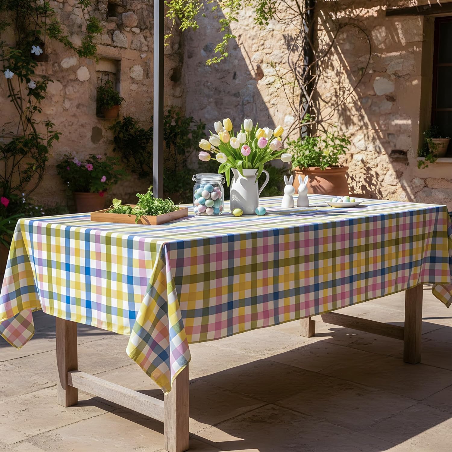 Brighten your home this Easter with soft spring colors! This pastel gingham waterproof tablecloth is designed to bring warmth and elegance to your dining space. The charming checkered pattern in pink, yellow, green, and blue captures the essence of spring and the joyful spirit of Easter. Crafted from 100% polyester fabric with a waterproof coating, it provides reliable protection against spills and stains while maintaining a smooth, cloth-like texture. Durable, washable, and reusable—ideal for both everyday use and festive gatherings. Whether you’re hosting a family brunch or decorating for an Easter egg hunt, this colorful checkered tablecloth makes your table setting fresh, bright, and full of life.