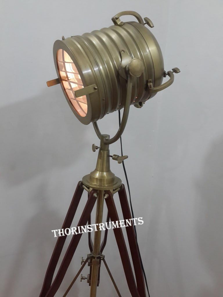 Designer Vintage Searchlight Antique Heavy Build Wooden Tripod Stand Material: Wood/Steel & Aluminum Front Diameter: 10" Depth: 11" Height: 67" Finish: Antique Brass